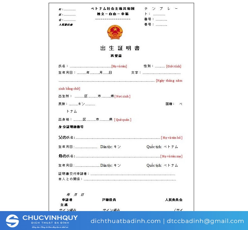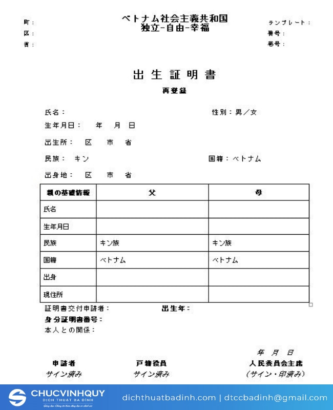 Mẫu bản dịch giấy khai sinh sang tiếng Nhật