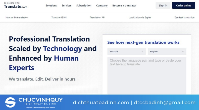 Nổi bật với tốc độ dịch nhanh chóng, ngoài tiếng Nga, translate.com còn hỗ trợ dịch nhiều ngôn ngữ kacs trên thế giới. Ngoài ra, trang web còn có chế độ dịch bởi những dịch giả chuyên nghiệp với giá 0,07$/ từ, đảm bảo bản dịch được chuẩn xác hơn.